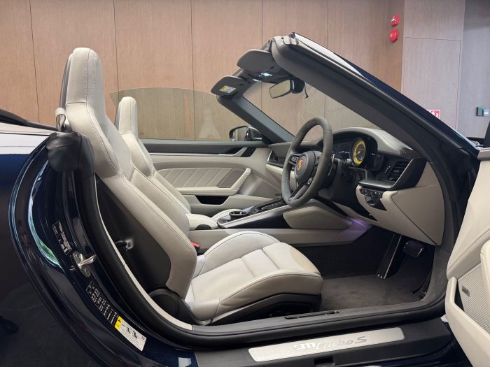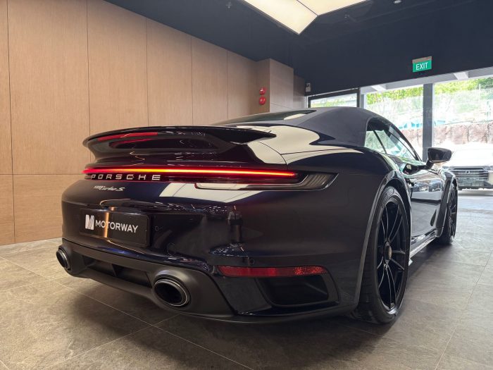 Pre Registered Porsche midnight blue pearl 992 Turbo S with blue soft top for sales! Come with 3 years/100,000km whichever come first in house warranty from reg date! 3 point seat belt infront with manuel height adjustment. Sport seats plus. Porsche ceramic composite brakes (pccb) with yellow calipers. Electric seats with driver memory seats in front. Trade-in welcome! Contact us now!